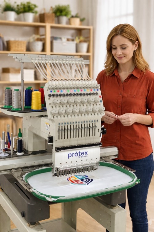 Mas a grande virada acontece quando o negócio sai do artesanal e entra na escala. E é exatamente aí que entra a máquina de bordado industrial.